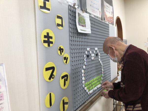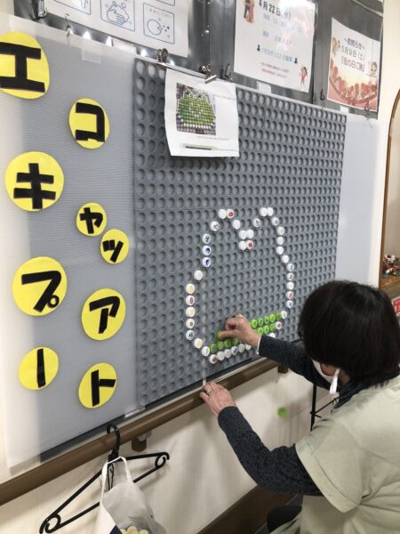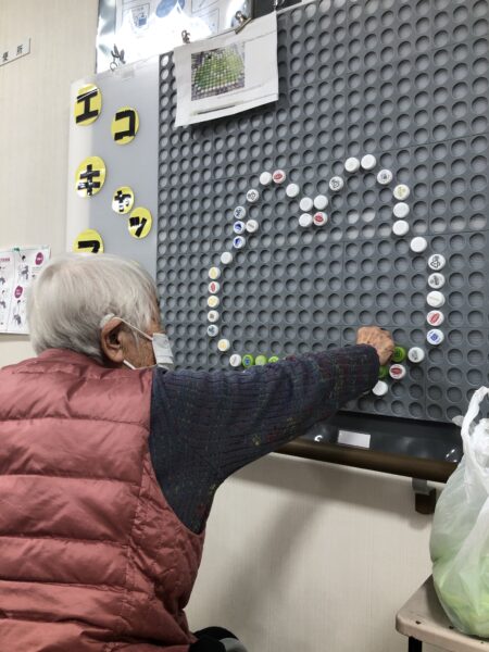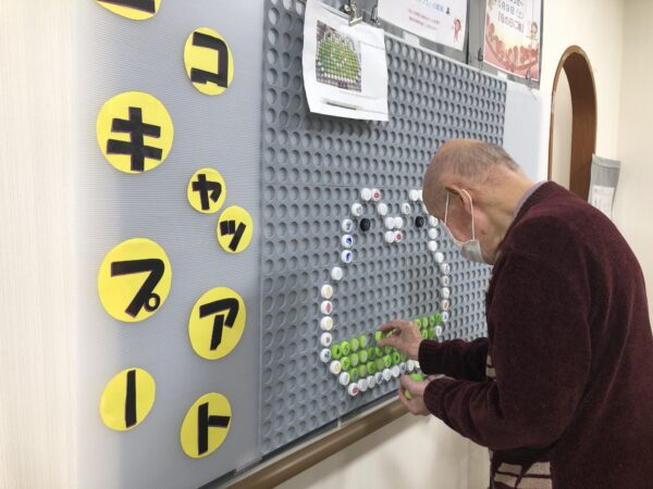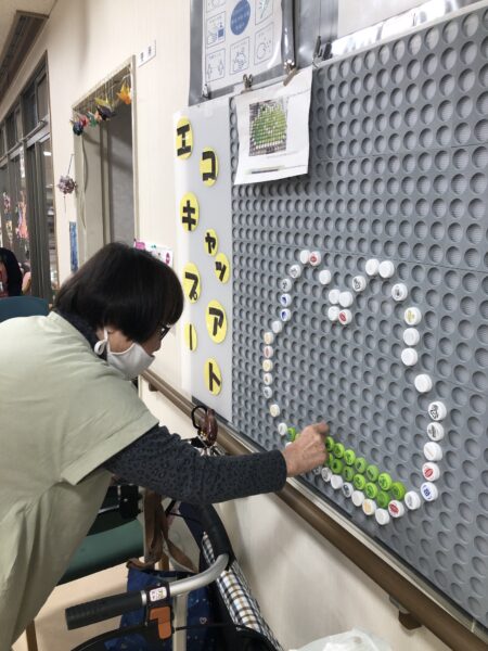 デイケアでもウキウキするような新しい事にチャレンジする事にしました😊💕  専用パネルにペットボトルのキャップをはめて頂いています😀